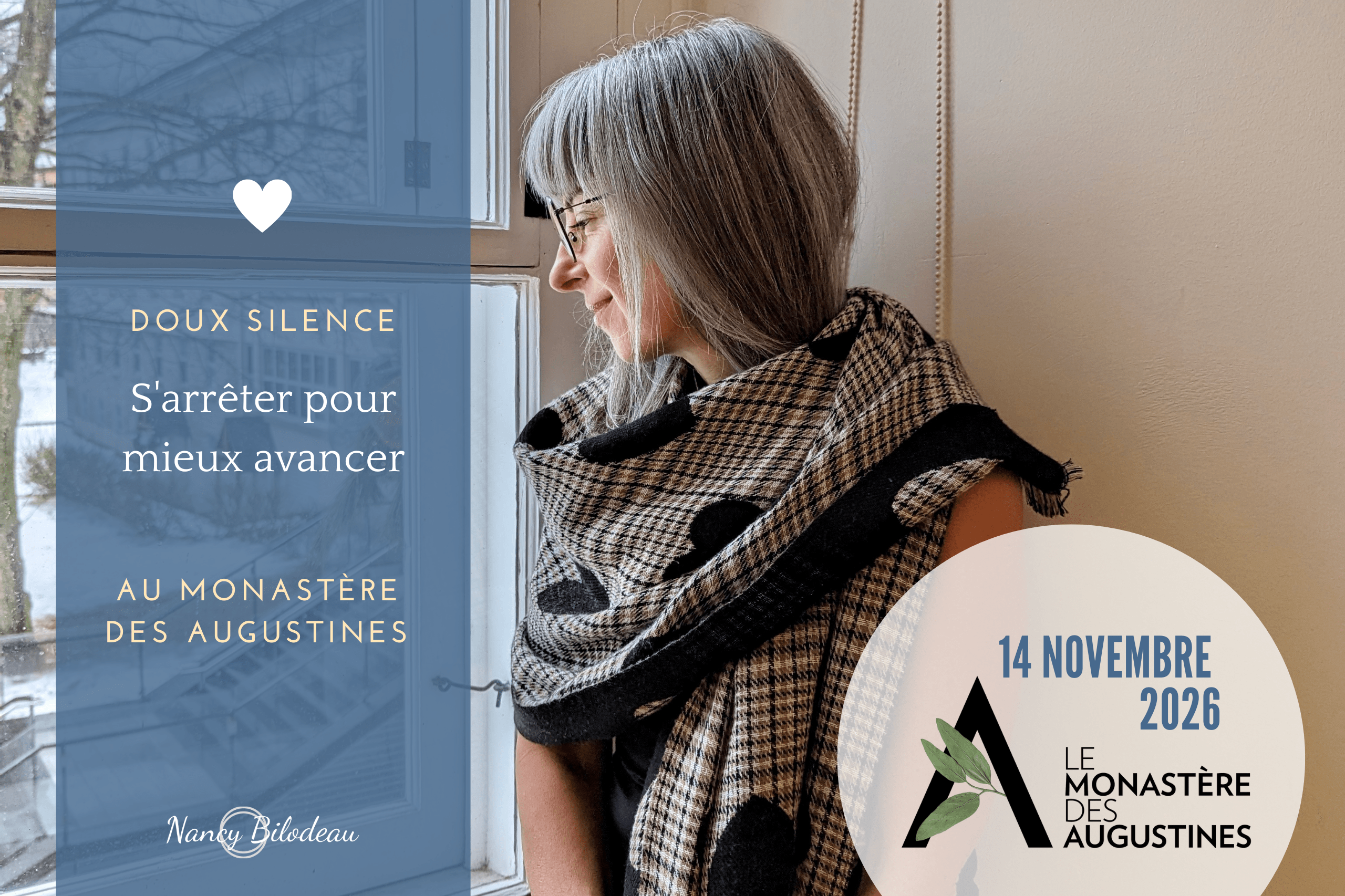 J'ai adoré mon expérience de retraite en silence au Monastère des Augustines avec Nancy Bilodeau. Tout en douceur, je me suis donné le droit de prendre soins de moi, de m'arrêter et m'observer avec curiosité le temps d'un week-end. J'en suis ressortie reposée et énergisée. Merci je suis remplie de gratitude.